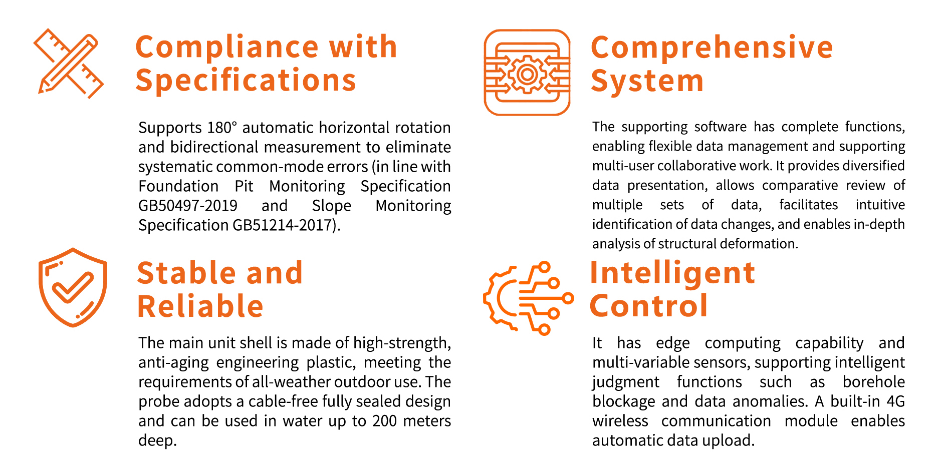 The lifting device and the probe are connected by a high-strength traction rope instead of cables, which significantly reduces the equipment weight. Meanwhile, combined with wireless charging and transmission technology, the probe can adopt a fully sealed design to enhance its deep-water waterproof performance. When the lifting motor rotates, it drives the rope to control the probe's movement up and down in the inclinometric hole, thereby completing continuous measurement at 0.5-meter intervals. After the probe is lifted into the rotating device, the rotating motor can be used to control the probe to rotate 180 degrees, realizing two measurements (forward and reverse) as required by national monitoring technical standards and specifications (GB50497-2019, GB51214-2017) for slopes, foundation pits, etc. The difference between the two measurements is calculated to eliminate systematic common-mode errors.