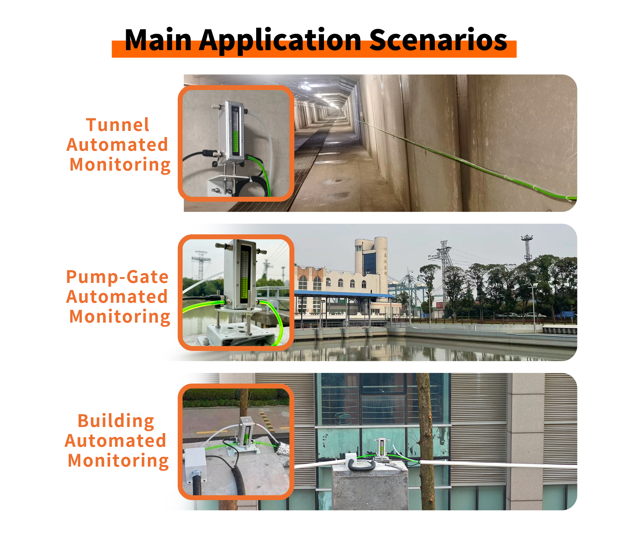 The intelligent vision hydrostatic level gauge, equipped with a CMOS line-scan camera, can directly detect the position of the liquid surface boundary and output the liquid level. Then all the levels will be transmitted to the platform which calculates the relative settlement of the structure.This intelligent vision hydrostatic leveling system consists mainly of hydrostatic level gauges (measurement points), connecting cables (including data buses, water pipes, and air pipes) and RTUs . The hydrostatic level gauges can be attached to the structure to measure elevation data along all the measurement points.This product is installed on the surface of the structure and can be used for settlement monitoring of dams,tunnels,buildings, and other structures.