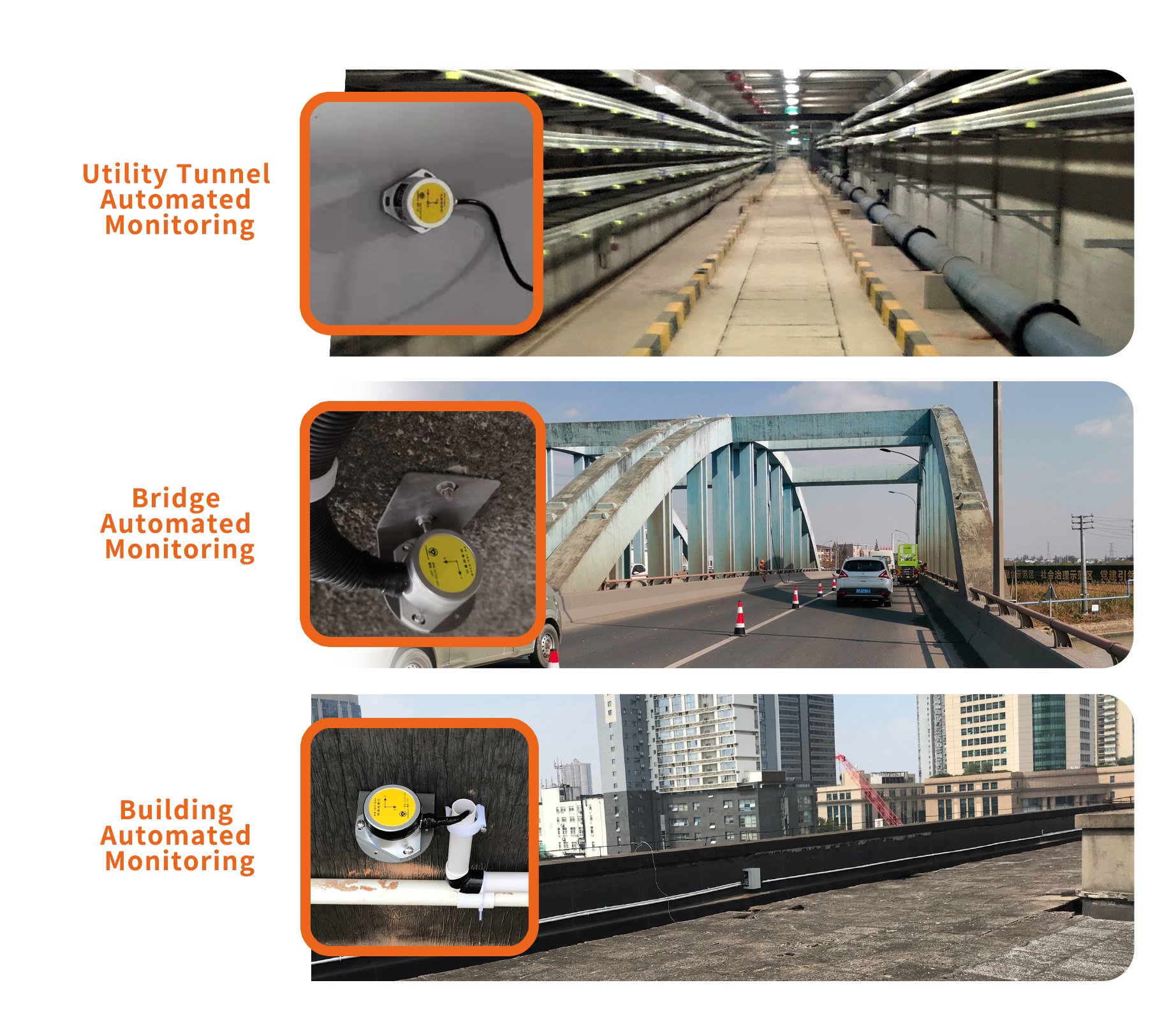 The tiltmeter integrates a high-precision MEMS in clinometer sensor along with corresponding data acquisition circuits and data processing algorithm, outputting tilt data via an RS485 interface. It can measure multiple-axis tilts simultaneously. This product is installed on the surface of structures and can be applied for the inclination monitoring of slopes, dams, buildings, bridges, tunnels, and underground utility corridors.