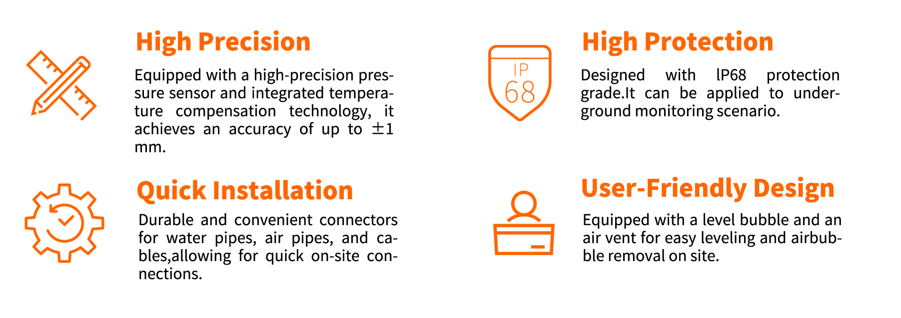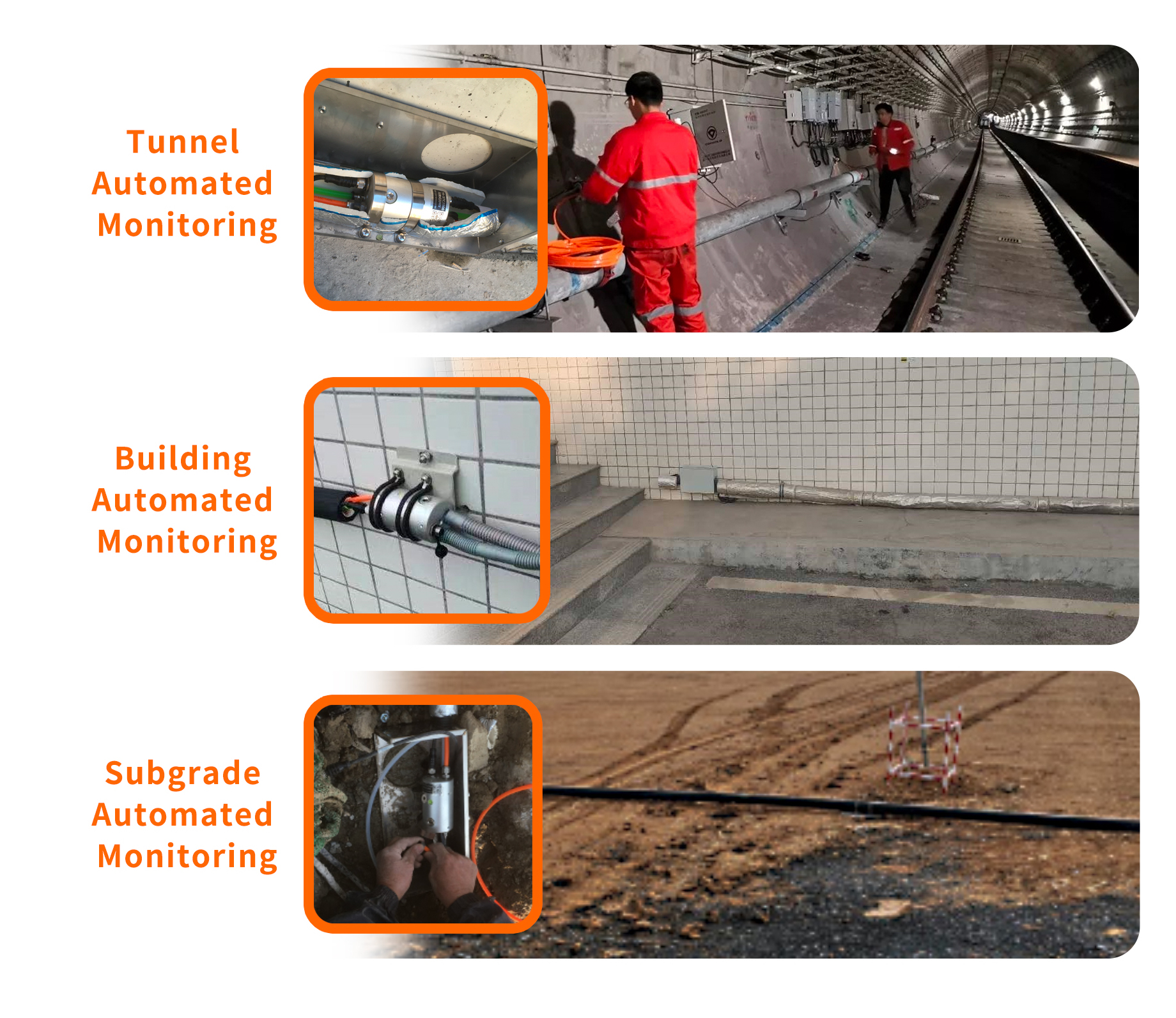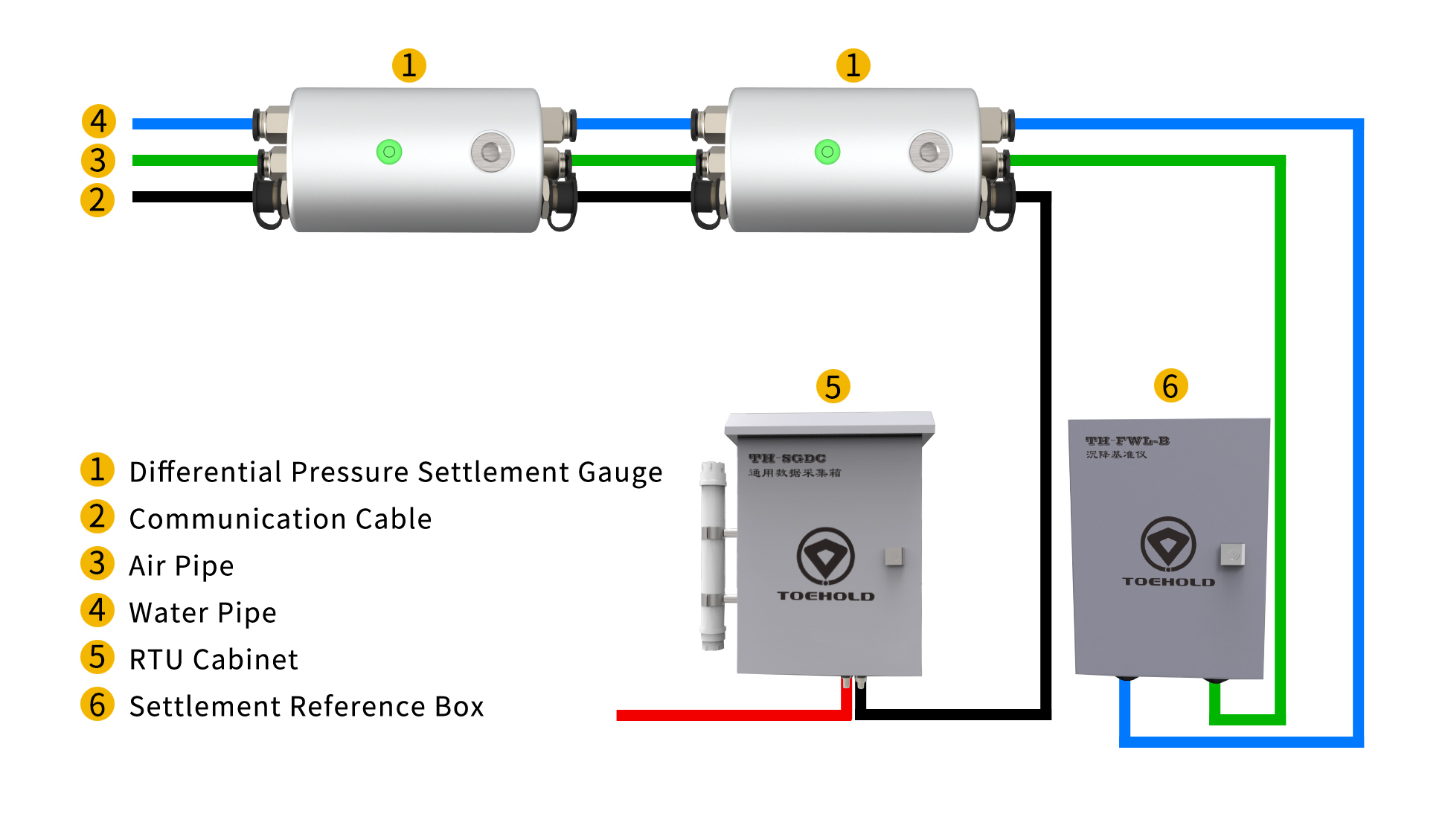 The differential pressure settlement gauge system mainly consists of a differential pressure settlement gauge (measuring point), connecting cables (including data bus, water pipes, and air pipes), a settlement reference tank, and a universal data acquisition unit. The differential pressure settlement gauge is equipped with an industrial-grade pressure sensor and operates on the differential pressure principle. It can be installed on the surface of structures or embedded deep within soil, making it suitable for settlement monitoring in buildings, slopes, tunnels, subgrades, and other structures.
