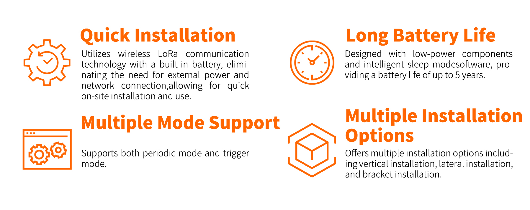 The product features an integrated design with a built-in battery and wireless LoRa transmission module, allowing for rapid installation and use in situations where power supply and network access are inconvenient.