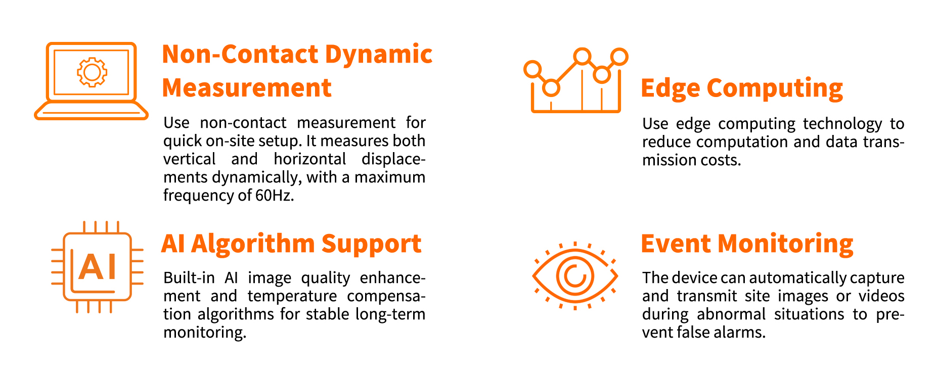 The intelligent vision gauge system uses IoT technology and intelligent disaster identification algorithms to convert image data into deformation data, achieving ultra-high precision, non-contact real-time measurements of various civil engineering structures. This enables long-term monitoring of structural health. The system consists of intelligent vision gauges, targets, on-site configuration software, and the TOEHOLD Sensing Cloud (a structural health monitoring management platform).