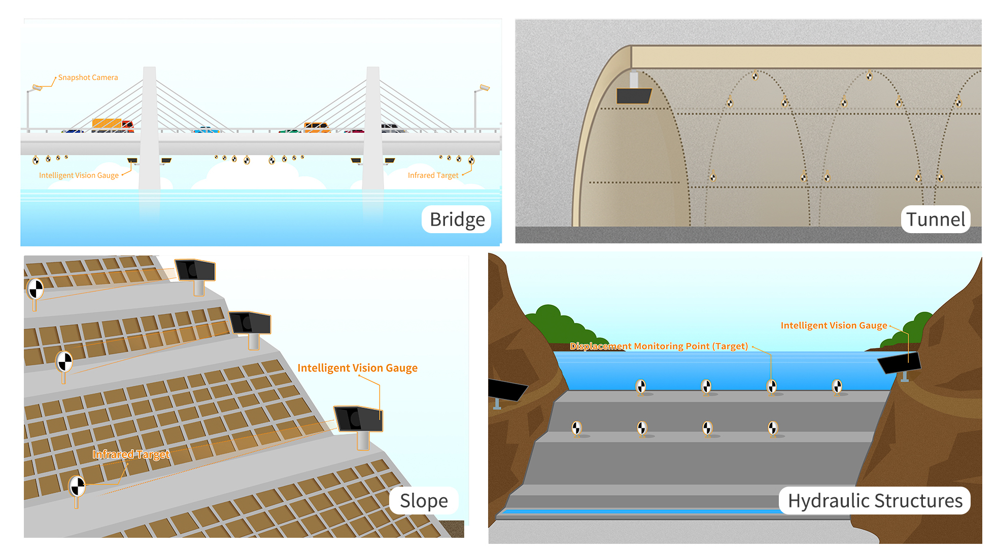 For the project, intelligent vision gauge are adopted to conduct structural health monitoring on the displacement of key bridge piers and the deflection of key box girders. A total of 13 intelligent vision gauges and 24 targets are used.