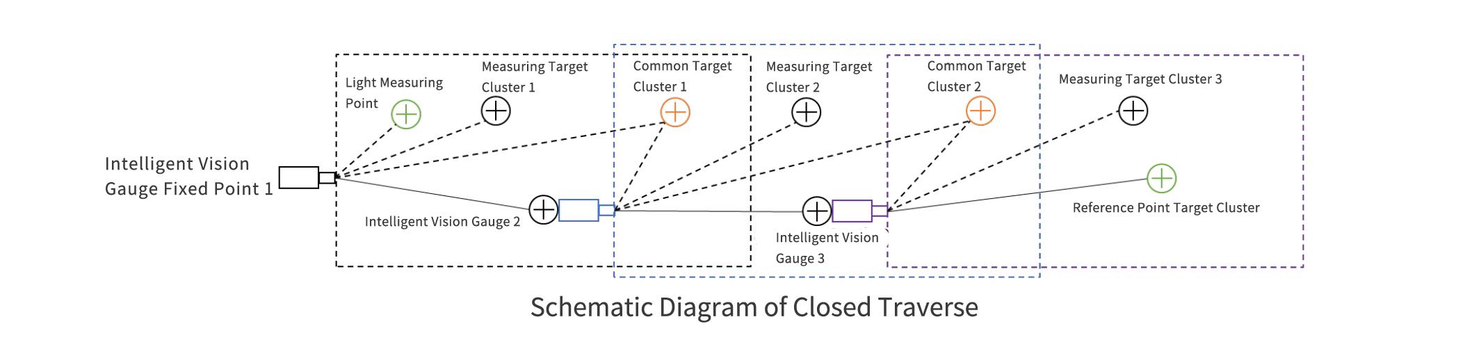 In long-distance tunnel measurement or measurement of long-distance, large-curved reservoir dams, using a single intelligent vision gauge for monitoring has a problem: the intelligent vision gauge measuring system with a single camera is limited by the field of view of image acquisition equipment, making it difficult to cover the entire range of the monitored structure. The adoption of "Intelligent Vision Transfer Measurement Technology" can solve the above problem. By means of forward transfer of multiple measuring gauges, a closed measurement traverse is formed, and combined with the transfer point calculation algorithm of measuring gauges, long-distance or curved measurement is realized.