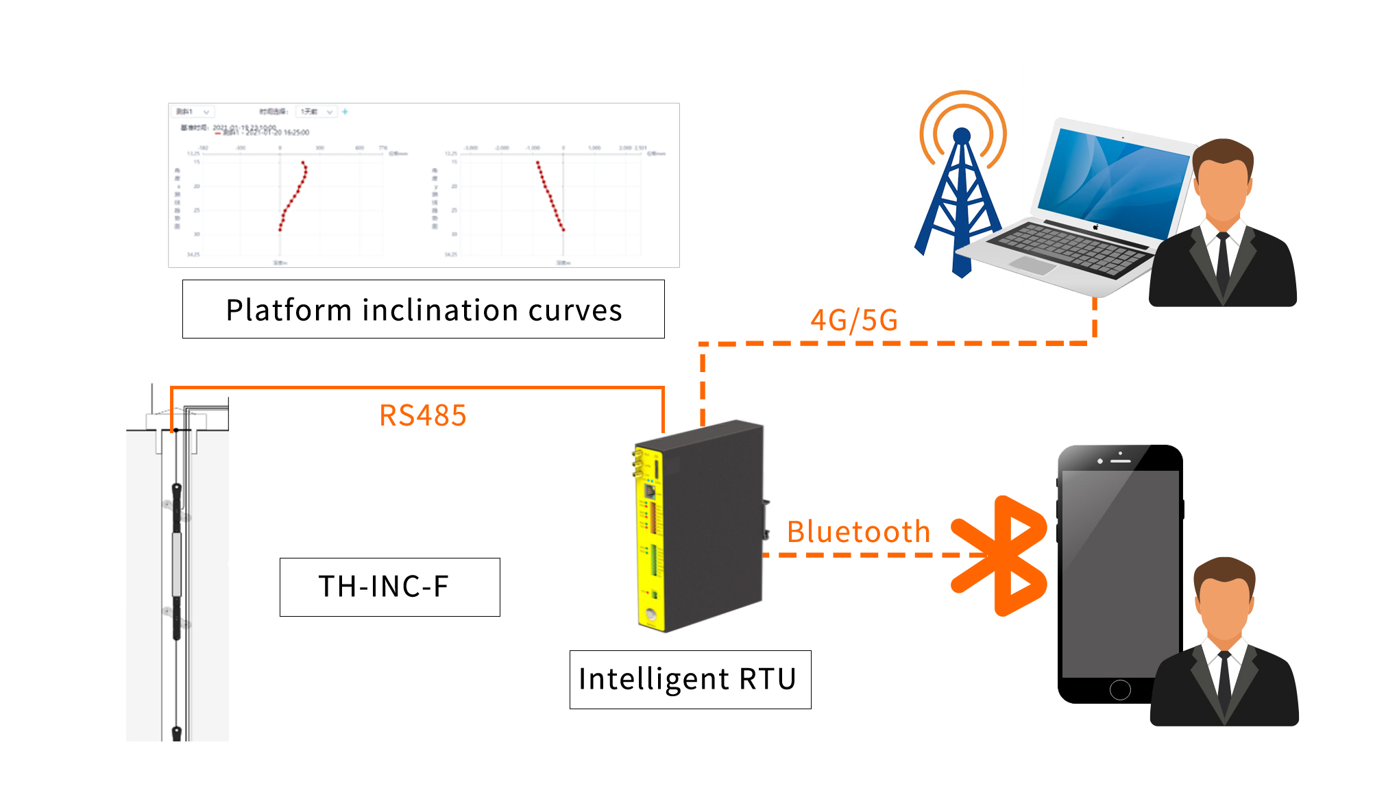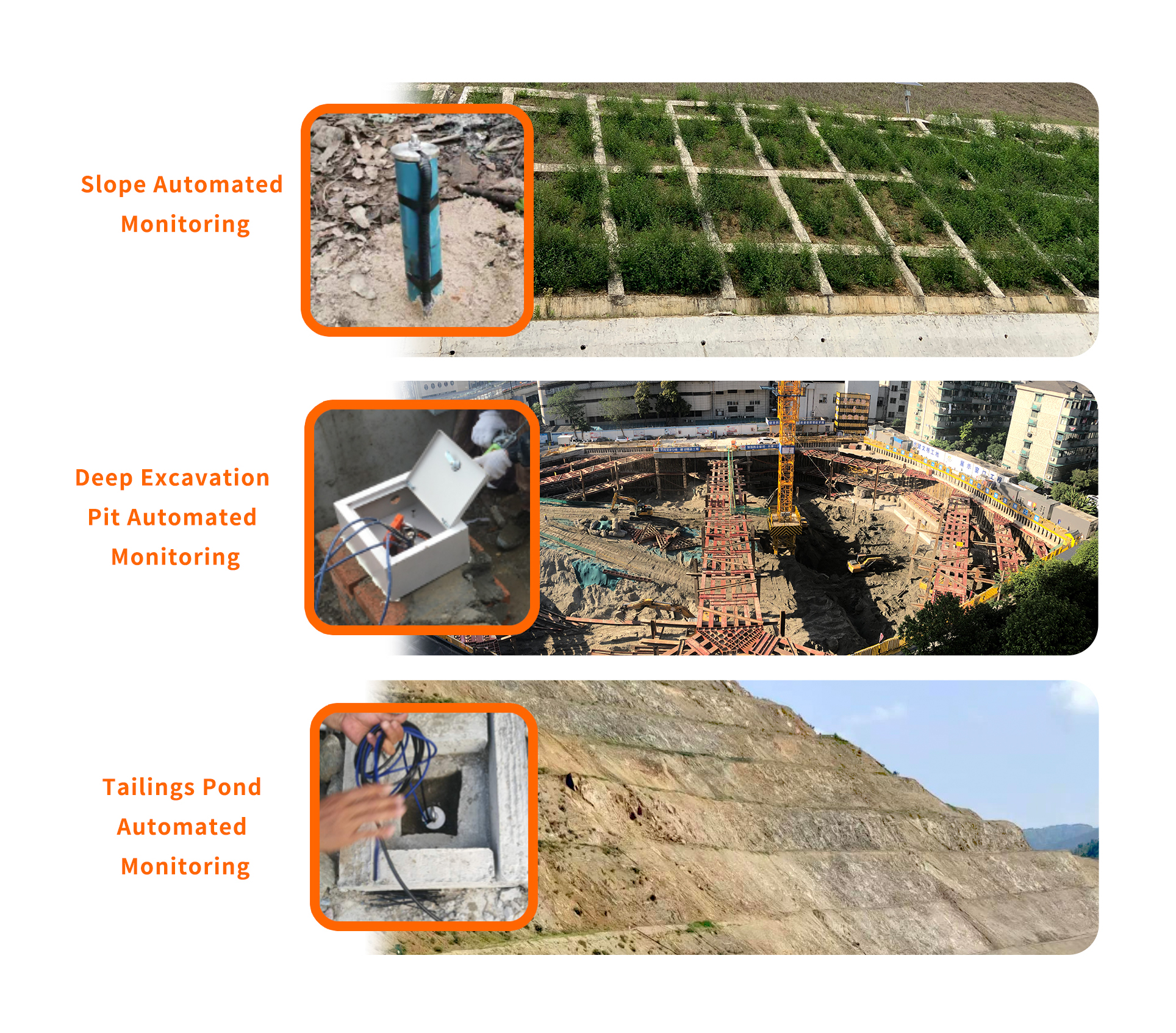 The in-place inclinometer system is composed of multiple inclinometers connected in series according to a preset spacing. It is primarily used for long-term automated monitoring of deep horizontal displacements in scenarios such as slopes, dams, and deep foundation pits. During long-term monitoring, if there is horizontal deformation within the structure, the system can automatically calculate the horizontal displacement at different depths by comparing the initial measured angle and the current real-time measured angle of different depth inclinometers, there by providing early warnings to prevent accidents.