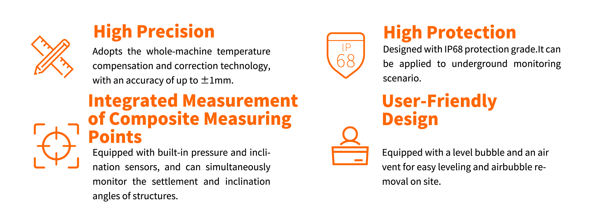 The integrated settlement and inclination gauge is internally fitted with an industrial-grade pressure sensor and a MEMS inclination sensor, adopting the differential pressure principle. It can be installed on the surface of structures or buried deep in soil, and is suitable for settlement and inclination monitoring of various structures such as buildings, slopes, tunnels, and roadbeds.