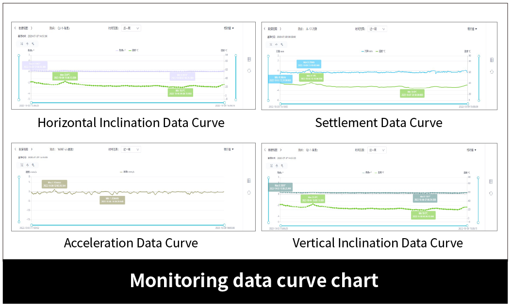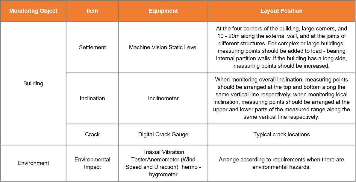 In accordance with the requirements of the Code for Building Deformation Measurement, intelligent vision gauges inclinometers, strain gauges, and environmental temperature and humidity meters are respectively used to monitor items such as settlement, inclination, strain, and environmental temperature and humidity. Additionally, video surveillance is supplemented for real-time monitoring of the surrounding conditions of the building, facilitating better guidance for subsequent construction.