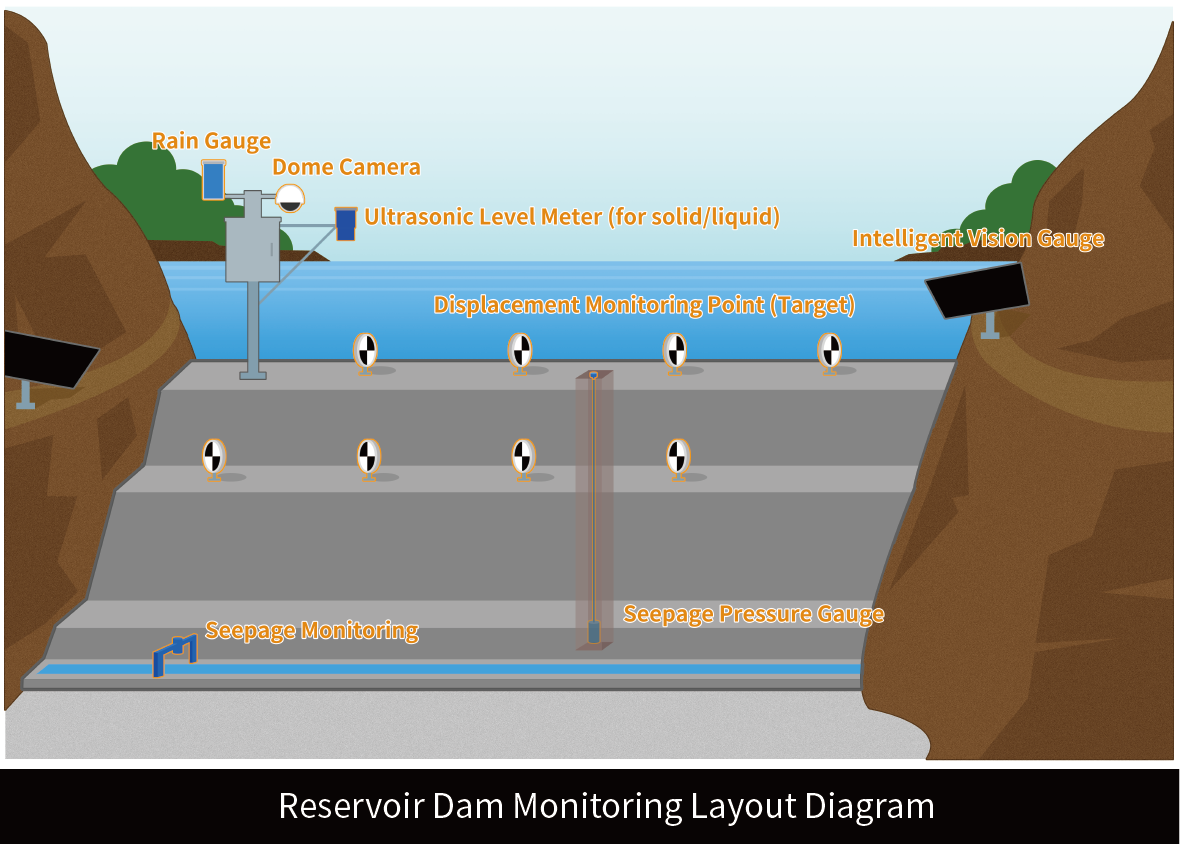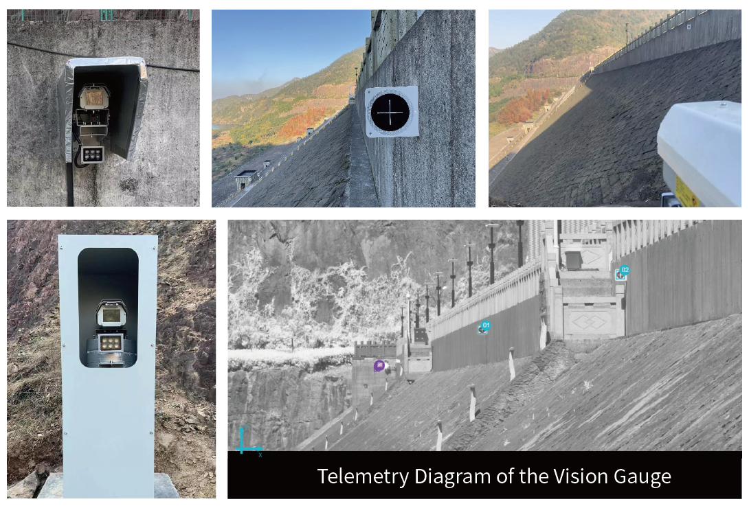 The intelligent vision gauge system is installed in stable areas on the shore, with targets placed at intervals of 20 to 50 meters on the dam crest or body. To improve monitoring accuracy, reference measurement points are added, and are generally installed in stable areas on the opposite shore.