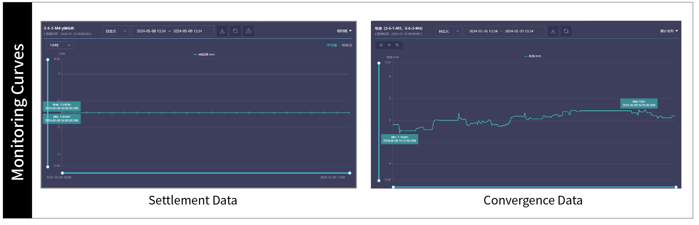 Since the monitoring system was installed, the equipment has been operating well, and the monitoring data remains stable. The settlement and convergence of the tunnel are no more than 2 mm, which are within the control range, indicating the stable structure of the tunnel.