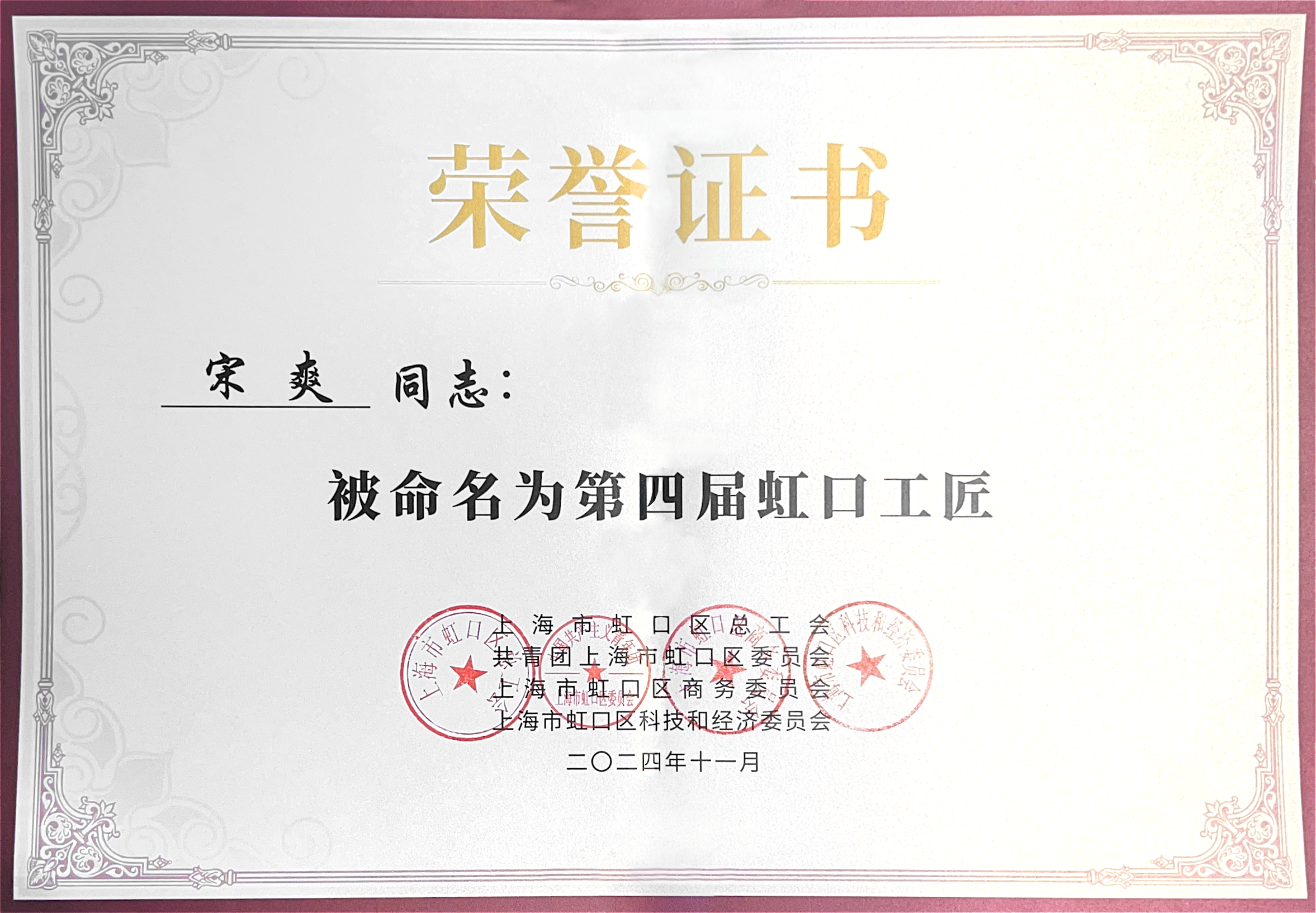 On May 12, the 2025 Hongkou District Model Worker Commendation Conference, entitled “Passing the Torch Through a Century, Striving in the Prime Time”, was grandly held at the Hongkou Workers’ Cultural Palace. The conference recognized 2 National Model Workers and Advanced Workers, 3 Shanghai Model Collectives, 10 Shanghai Model Workers and Advanced Workers, 1 Shanghai Craftsman of 2024, and 19 recipients of the 4th Hongkou Craftsman title. Song Shuang, General Manager and Chief Engineer of Toehold Technology, was honored with the title of "4th Hongkou Craftsman."