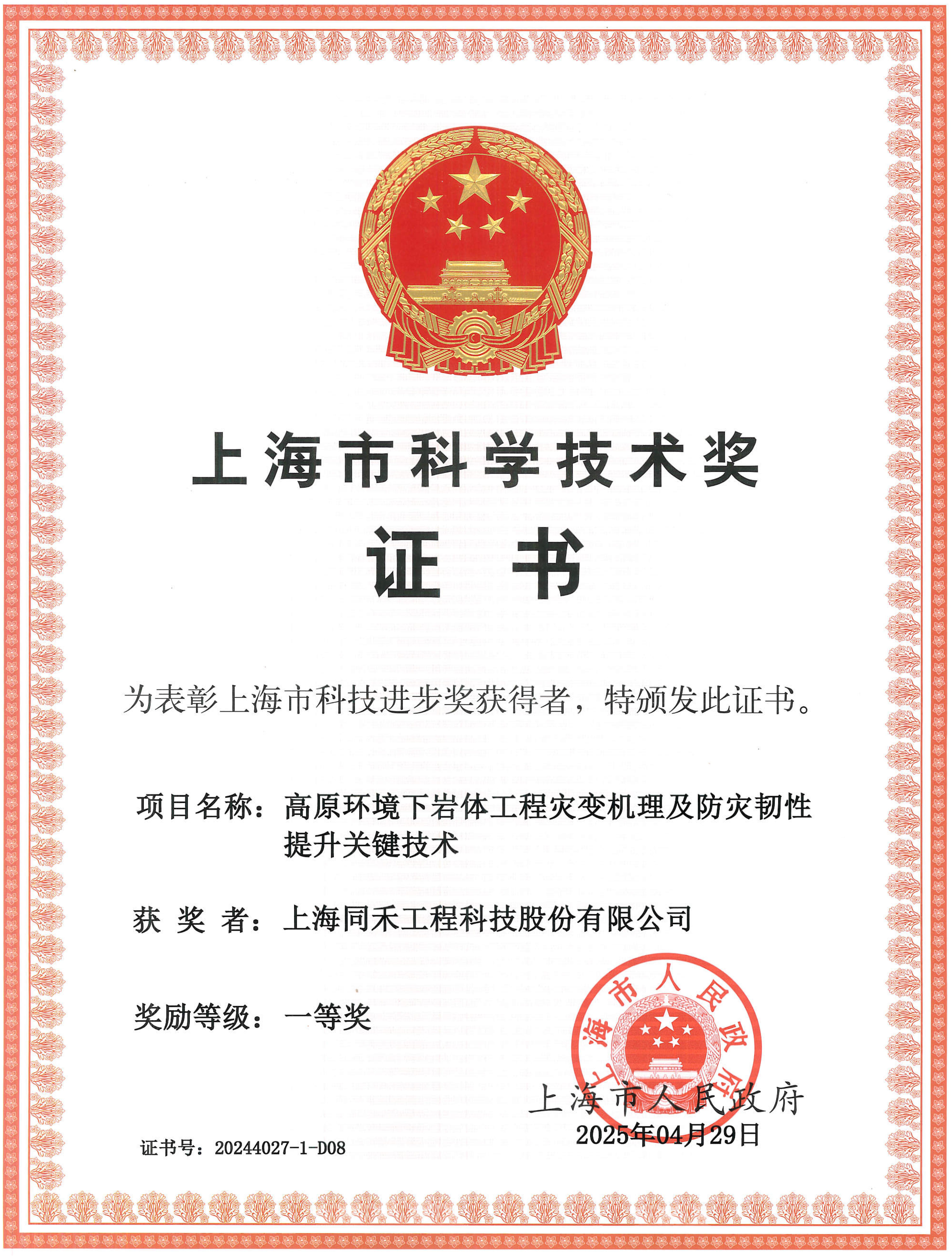 On August 26, the 2024 Shanghai Science and Technology Awards were officially announced. The project titled "Key Technologies for Disaster Mechanism and Resilience Enhancement of Rock Engineering in Plateau Environments", jointly submitted by Shanghai Toehold Engineering Technology Co., Ltd. (hereinafter referred to as "Toehold Technology"), Tongji University, Tibet Transportation Development Group Co., Ltd., CCCC First Highway Consultants Co., Ltd., Tibet University, University of Science and Technology Beijing, Shijiazhuang Tiedao University, and Shanghai Chengtou Highway Investment (Group) Co., Ltd., was honored with the First Prize of the Shanghai Science and Technology Progress Award!