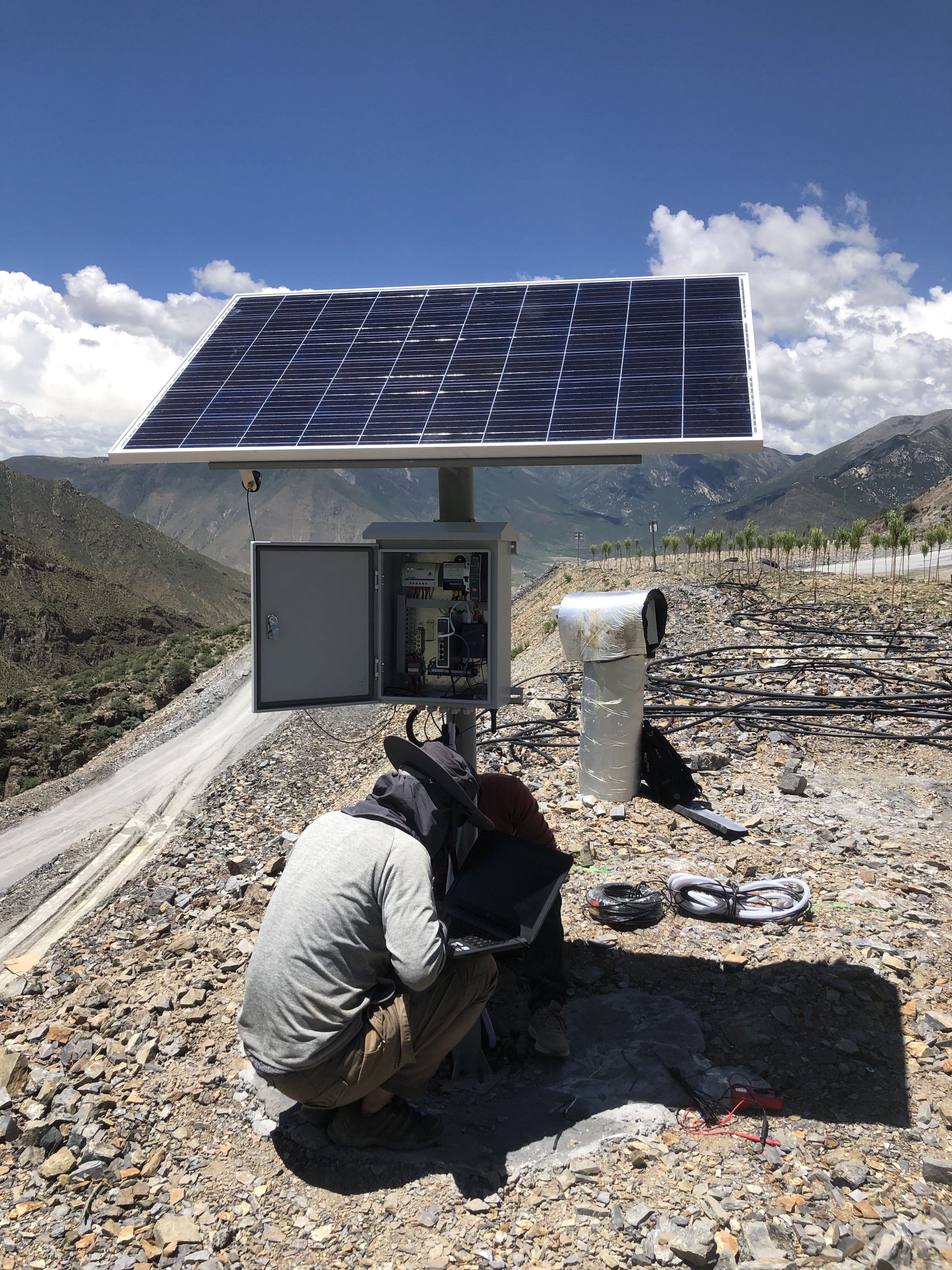 The team is installing monitoring equipment on a slope in Tibet