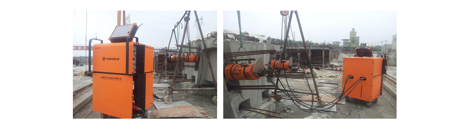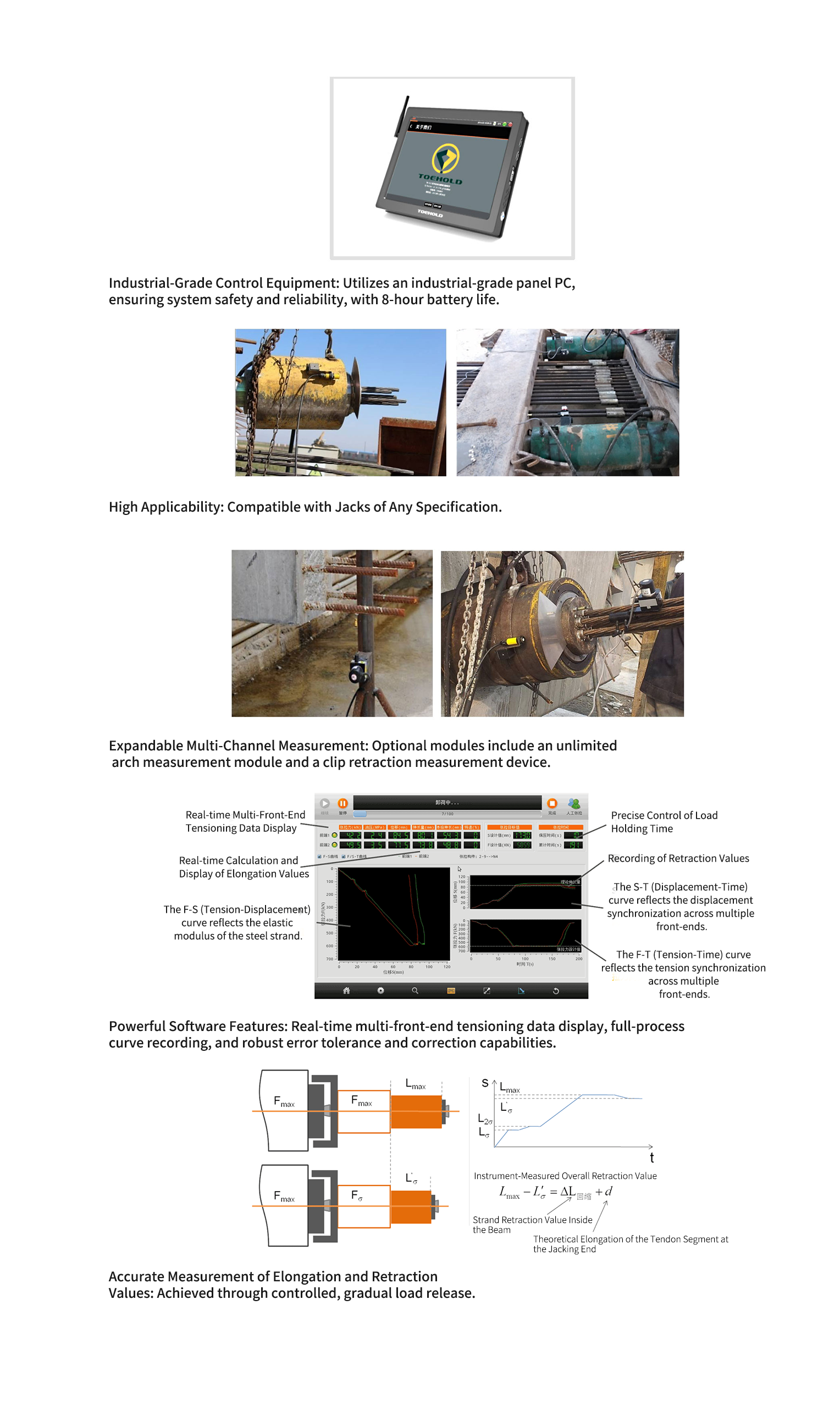 The numerically controlled oil pumps monitor key data points such as the jack's working tension and the elongation (or retraction) of the steel strands. This data is transmitted in real-time to the host unit, which subsequently sends back control commands. Based on these instructions, the pumps dynamically adjust the inverter's operating parameters. This allows for highly precise real-time regulation of the oil pump motor's speed, ensuring accurate control over the tensioning force and loading rate.